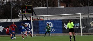 Ingrid Dannow Eiken i kamp om ballen mot Kongsvinger. Andrine Nevstad og Maria Erland avventer situasjonen i bakgrunnen. Kampen ender 0-2 på Nordre Åsen. Foto: Anders Høilund.