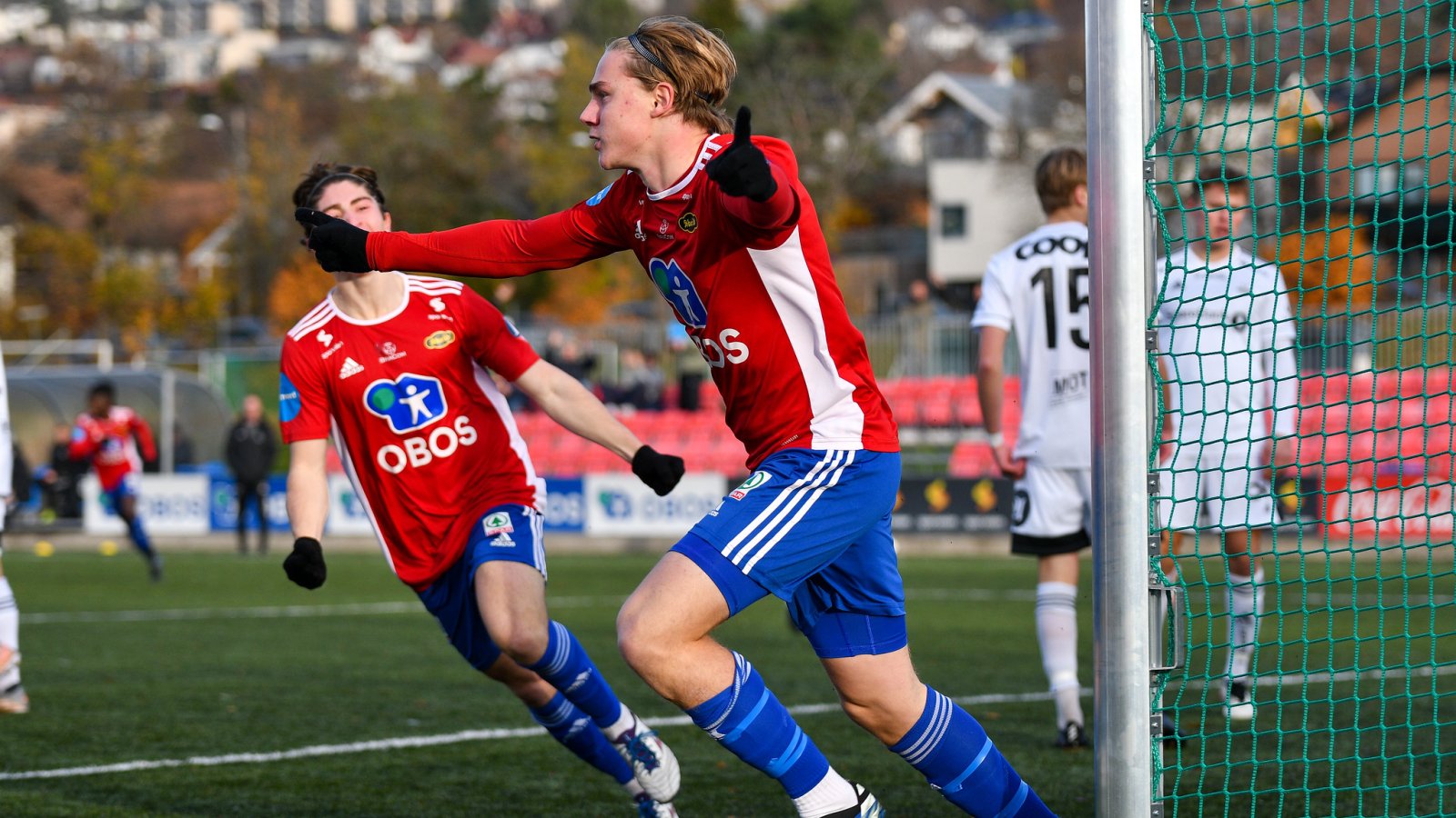 Abel Stensrud feirer 1-0-målet mot Fløy og gratuleres av Felix Anthonessen på Nordre Åsen i september. (Foto: Anders Vindegg)