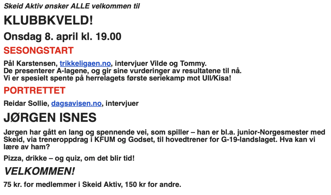 Tidligere Skeid-spiller Jørgen Isnes er en del av programmet på klubbkvelden 8. april!