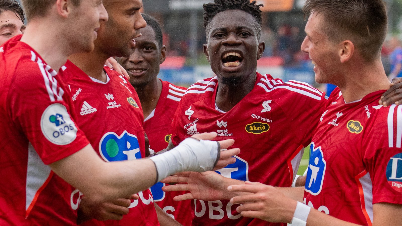 (Toppbilde: Bendik Rise, Johnny Buduson, nykommer Maxwell Effiom og Jakob Romsaas kunne feire da Skeid tok ledelsen. Foto: Anders Vindegg.)