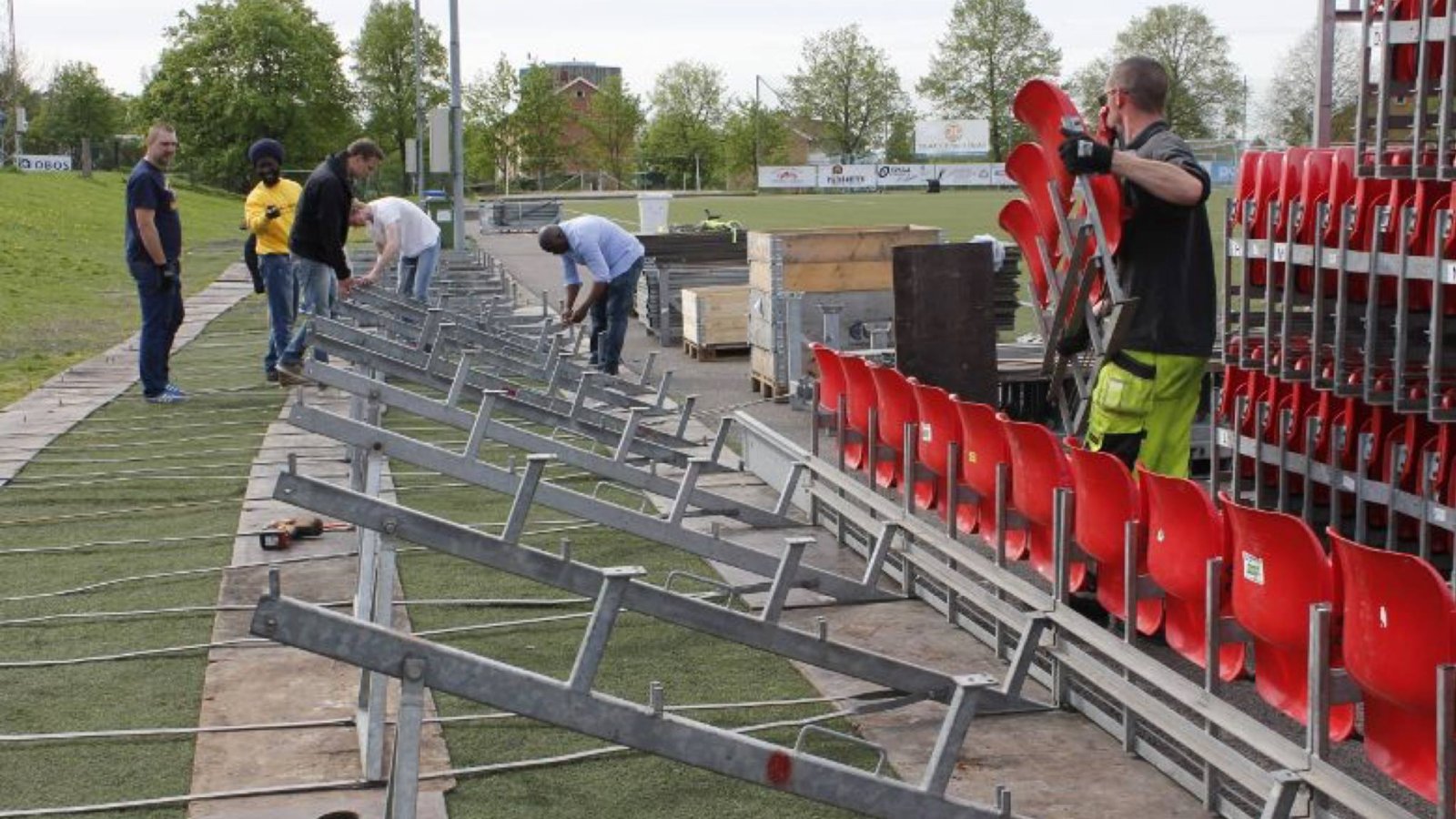 Mange har allerede gjort en flott jobb med tribunene. Nå håper vi at 20 Skeid-venner kan være med på dette. Det blir litt lettere enn forrige gang. Tribunene skal lagres bak den søndre tribunen, så reisverket skal ikke bæres langt. Setene settes rett i lagringsenhetene deres.