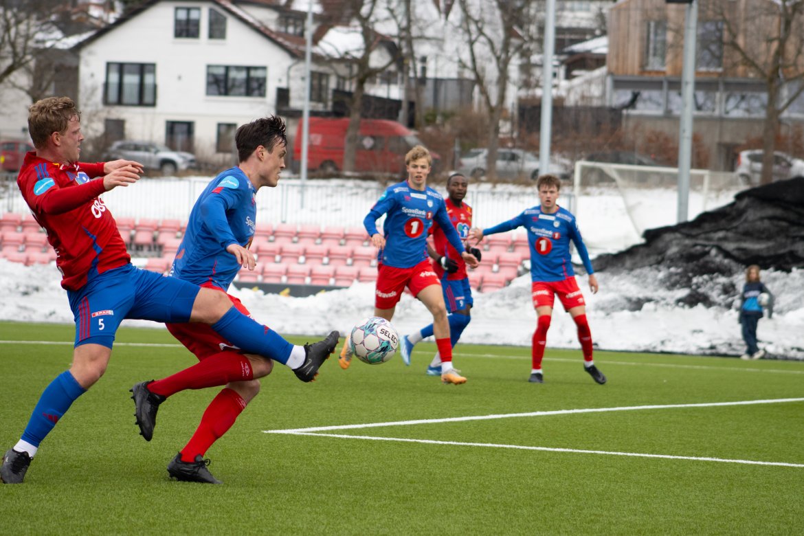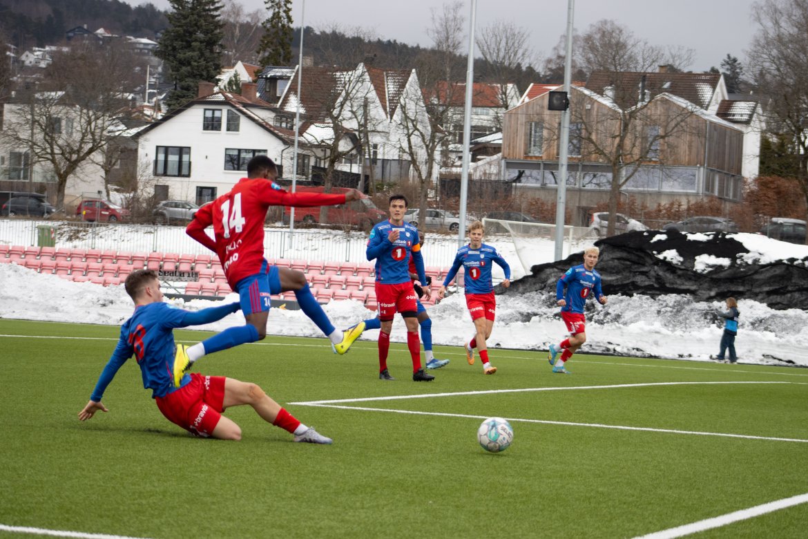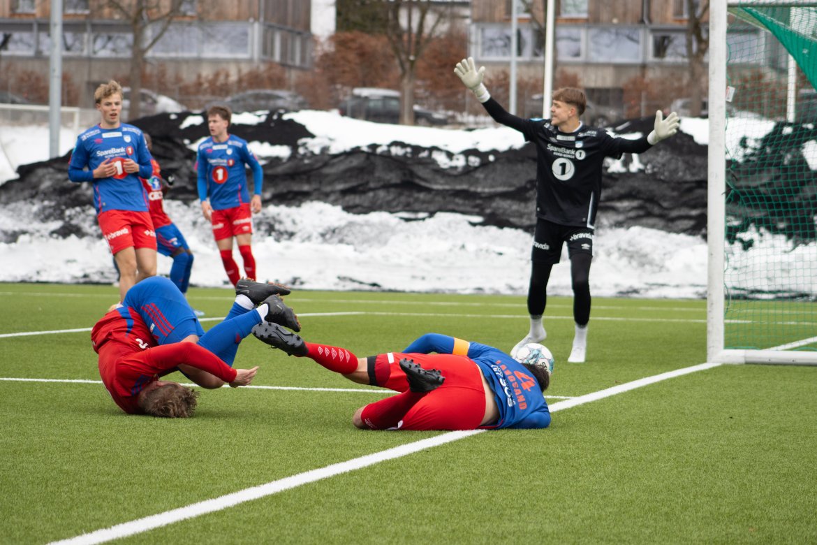 (Forsidefoto: Innlegget til Thor Lange (nr. 2 fra v.) har nettopp gått i mål via en forsvarer. Foto: Manuel Eriksen)
