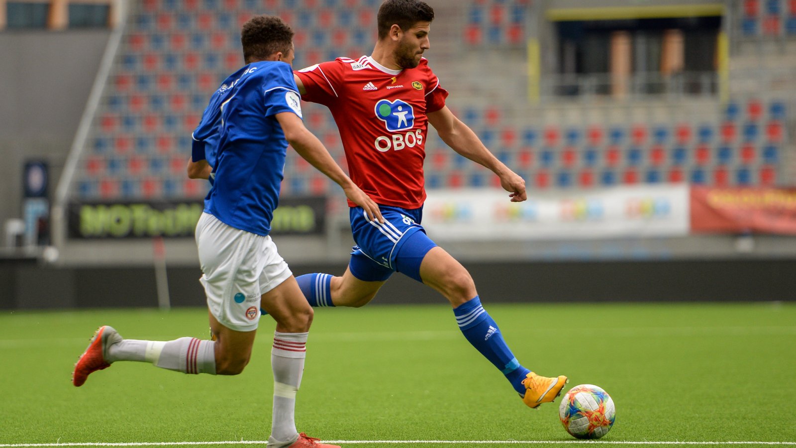Halvtimen er spilt og Johannes Nuñez prøver skuddfoten. Langskuddet smeller i Kåffas tverrligger. Så følger et lurt tatt frispark, David Tavakoli får foten på kula, men skuddet treffer ikke innenfor ramma. Nå er det hjemmelaget som fører kampen, men så skjer det som ikke skal skje. Stadionuret nærmer seg 45 minutter og på et sporadisk angrep må Tom Skogsrud klarere til hjørnespark. Inne i boksen sniker Jørgen Hammer seg forbi Tom Skogsrud og header i mål via foten til Tavakoli, dermed viser lystavla 0-1. Dommeren blåser for pause. Nå må Tom Nordlie gi sitt mannskap sine beste råd.