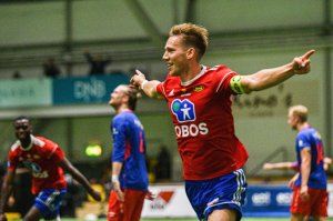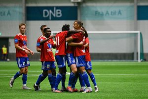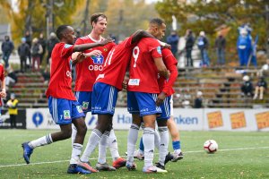 Taofeek Ismaheel gratuleres av Johnny, David H., Felix og Hassan etter 1-3-scoringen. Se alle høydepunktene fra Kjelsås-kampen her!